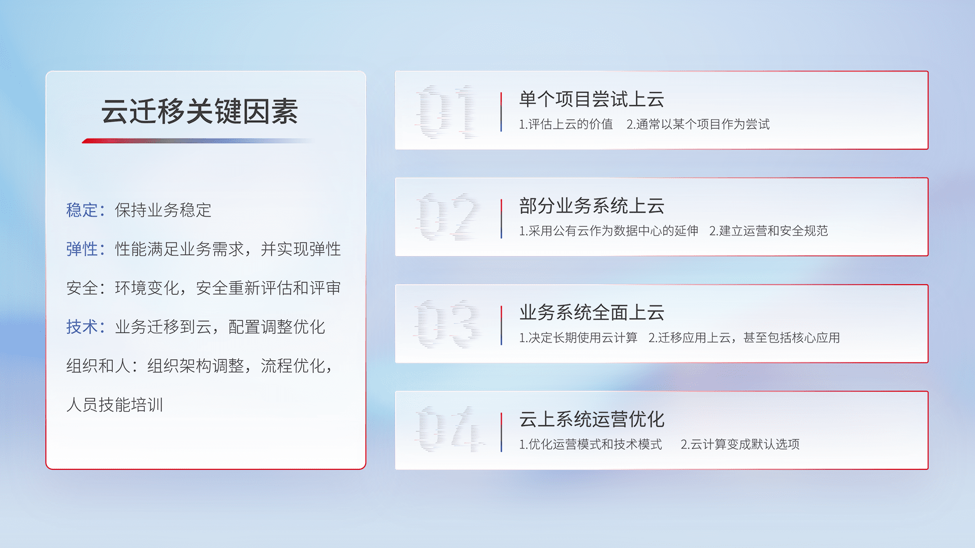 结合实际业务,,,从规划设计、、云平台选型、、、云原生改造、、、数据迁移、、、、集成交付,,,迁移全过程为客户识别最佳上云路径,,做好风险识别管理,,设计网络架构、、身份权限、、、安全审计合规、、、操作审计、、、、日志审计、、、、监控告警策略、、、多站点容灾设计等,,对云上基础设施进行整体规划,,,提升IT治理水平,,,以满足弹性、、、高可用、、、高性能的需求。。