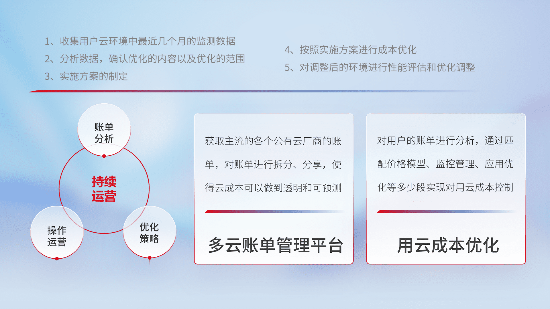 通过多云纳管,,,,以统一的资源数据模型把客户的云资源进行抽象和封装,,,进而实现对多云资源的统一操作,,保障云资源管理的可靠性、、、、稳定性与可用性。。。量身定制化运维内容,,配置、、开发运维、、、、补丁管理、、、、备份、、监控、、、认证和访问管理、、、、审计和日常巡检等,,,,保障在用云过程中的可靠度,,稳定度以及高可用率。。