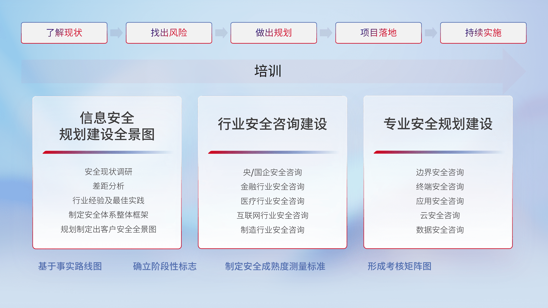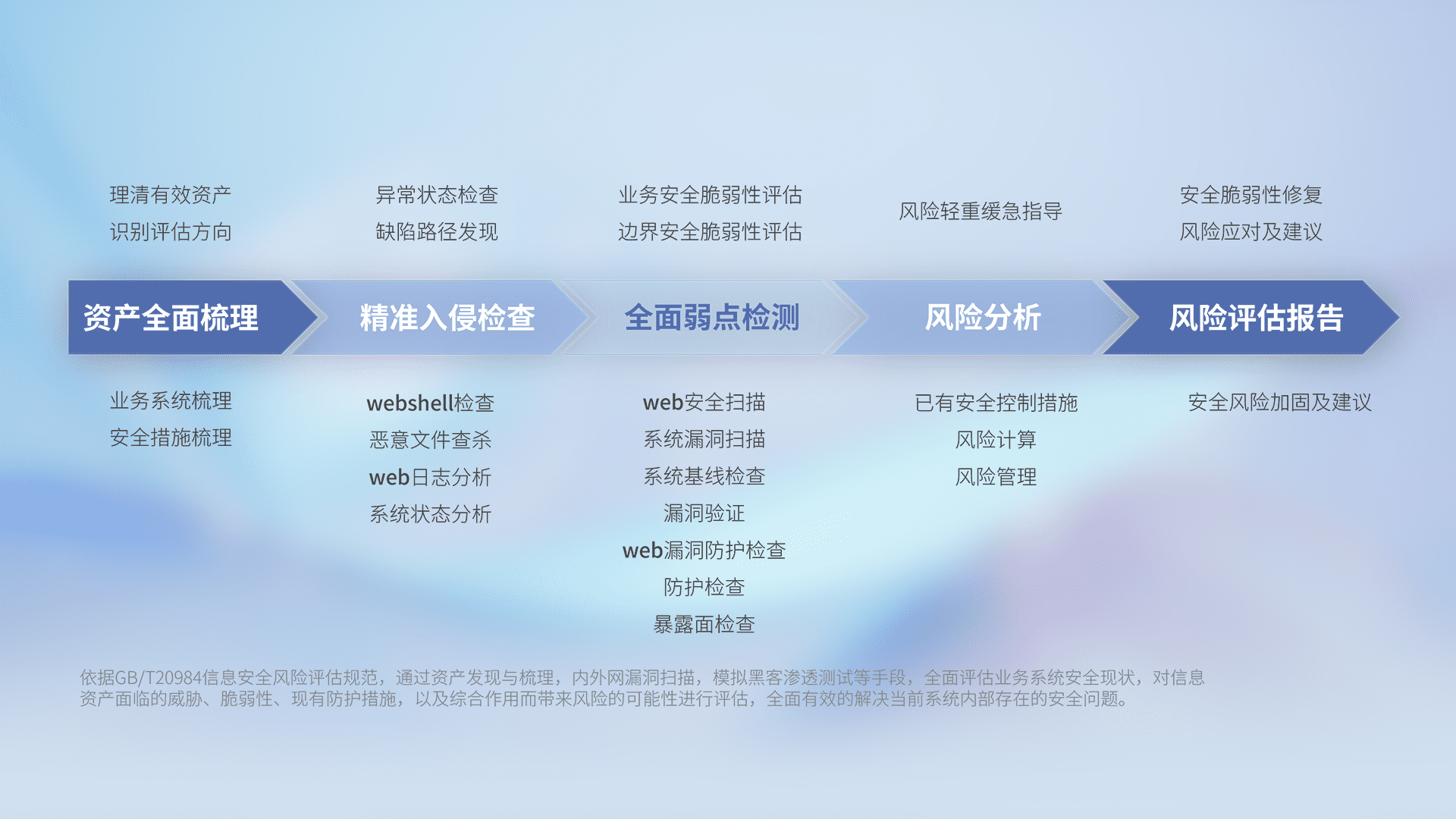 针对客户行业特性,,,以专业的安全服务+多厂商联合解决方案提供专属的一站式安全管理服务,,,帮助客户全面感知网络空间威胁,,,,基于识别、、检测、、分析、、防护、、、监测、、响应的服务理论模型,,从方案咨询、、、集成交付、、、、评估验证、、、、优化加固、、、运维运营,,致力于为客户提供完整的闭环管理式安全服务。。。以实战经验为客户打造高抵御风险的安全体系,,,,帮助客户发现威胁、、、、对抗威胁、、、、处置威胁,,不断积累安全对抗能力,,,持续保障数字化安全。。。
